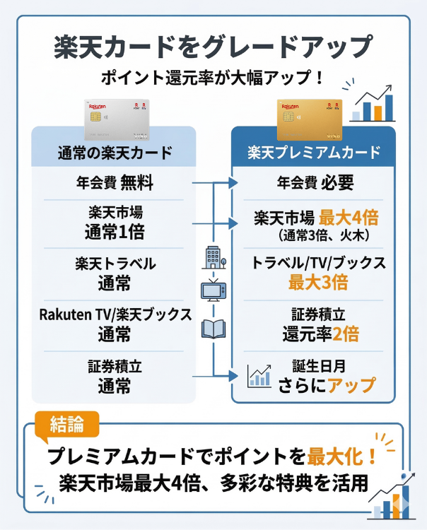 楽天カードは、年会費を支払えば「楽天ゴールドカード」や「楽天プレミアムカード」にグレードアップが可能である。