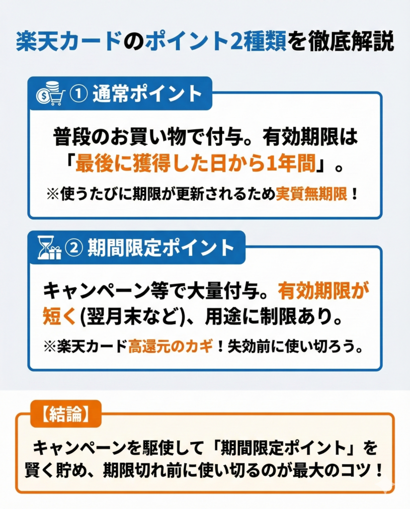 楽天カードには「通常ポイント」と「期間限定ポイント」の2種類のポイントがある。