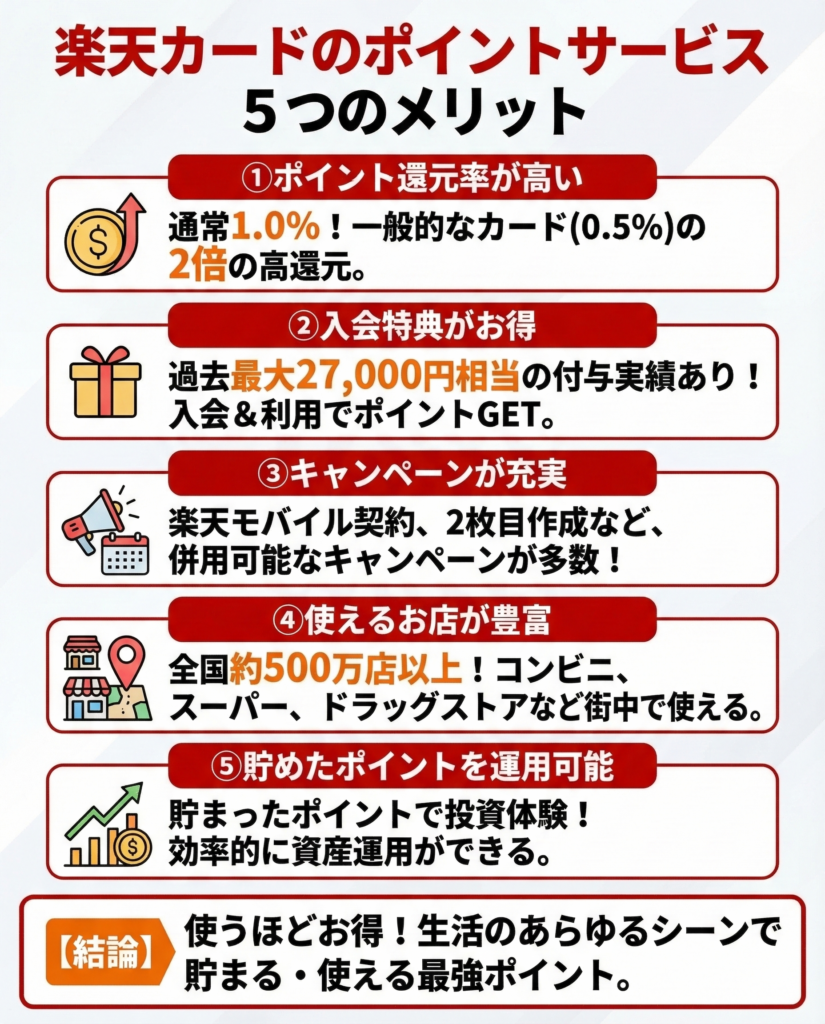 楽天カードのポイントサービスには、主に次の5つのメリットがある。