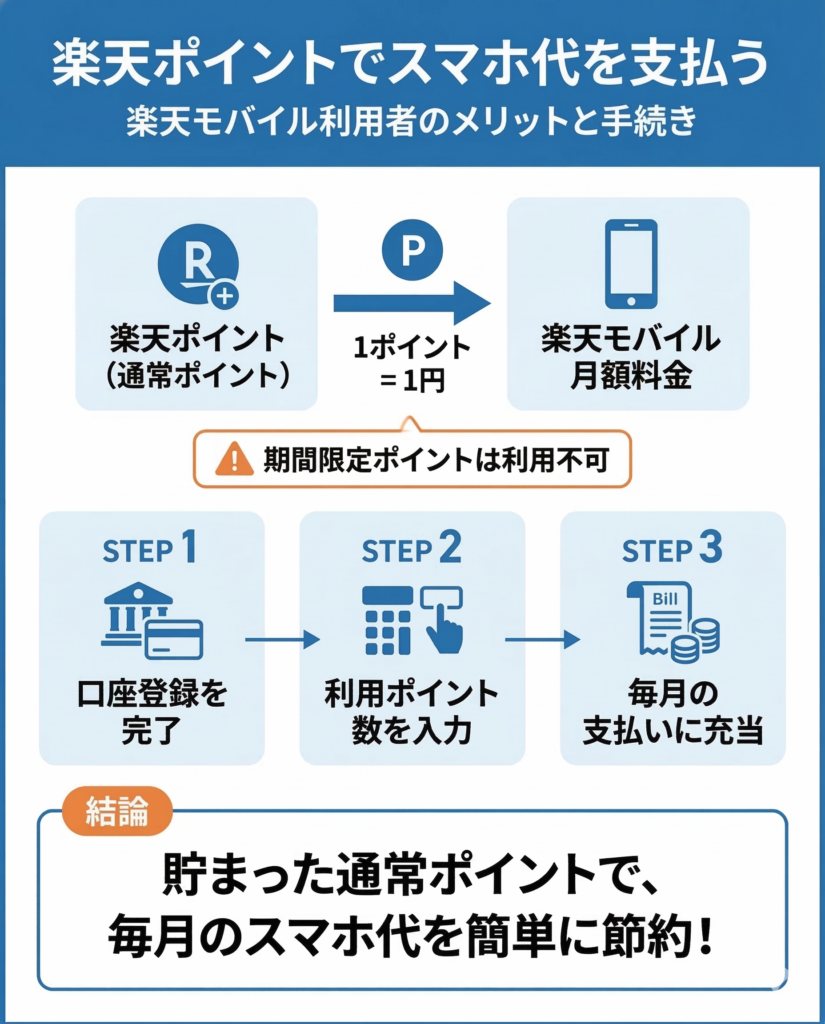 楽天モバイルを利用している人は、楽天ポイントを毎月のスマホ代の支払いに充当できる。