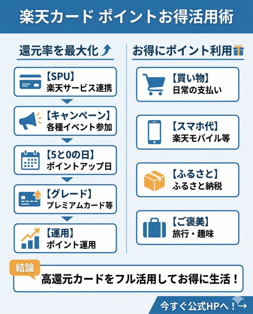 ポイントの還元率を上げるには、SPUやキャンペーン、5と0の付く日の利用、カードのグレードアップやポイント運用も効果的だ。