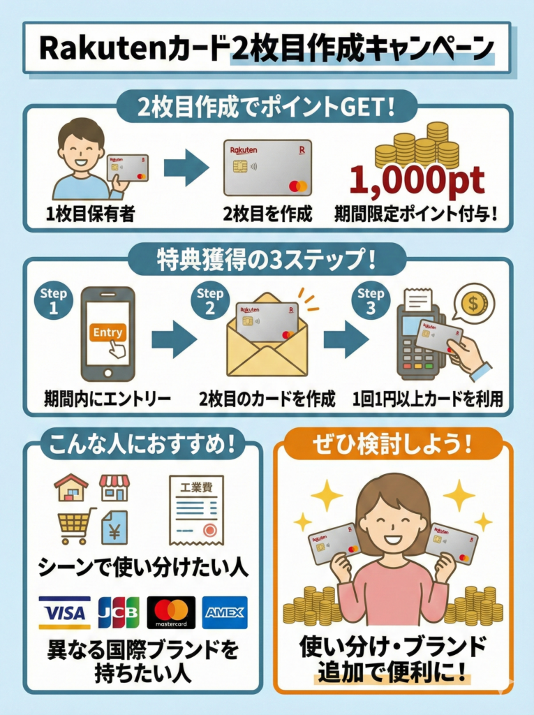 楽天カードでは、2枚目のカードを作成した際にもポイントがもらえるキャンペーンが案内されることがある。