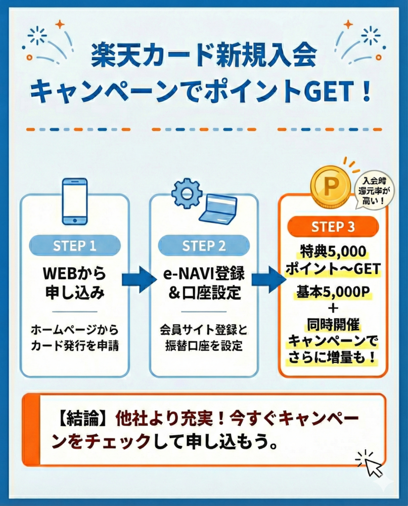 新規入会キャンペーンでは、楽天カードに申し込み、楽天e-NAVIに初回登録すると新規入会特典2,000ポイントが進呈される。さらに、申込月の翌月末までにカードショッピングを3回以上利用し、申込月の2カ月後25日までに口座振替設定を完了すると、カード利用特典3,000ポイントが進呈される例が案内されている。