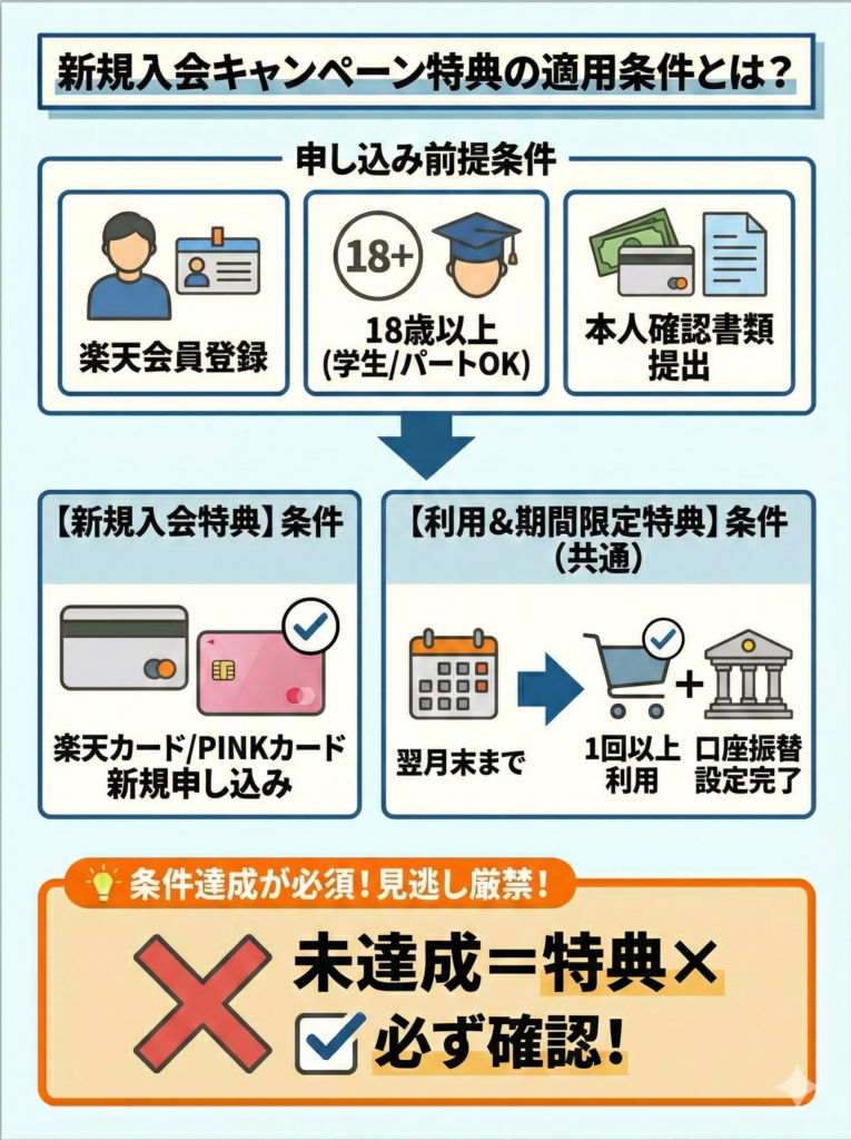 【新規入会特典】の対象者は、新規申し込みで楽天カードが発行され、カード到着後に楽天e-NAVIへ初回登録した人である。【カード利用特典】は、申込月の翌月末までにカードショッピングを3回以上利用し、申込月の2カ月後25日までに口座振替設定を完了した人が対象となる例が案内されている。