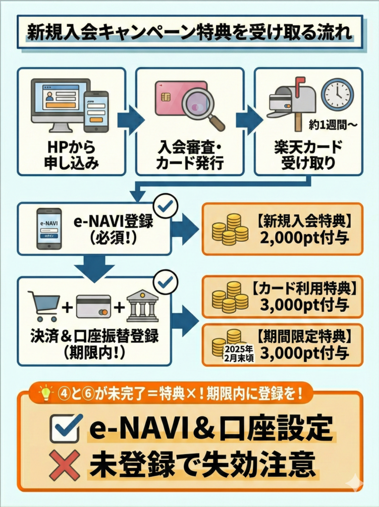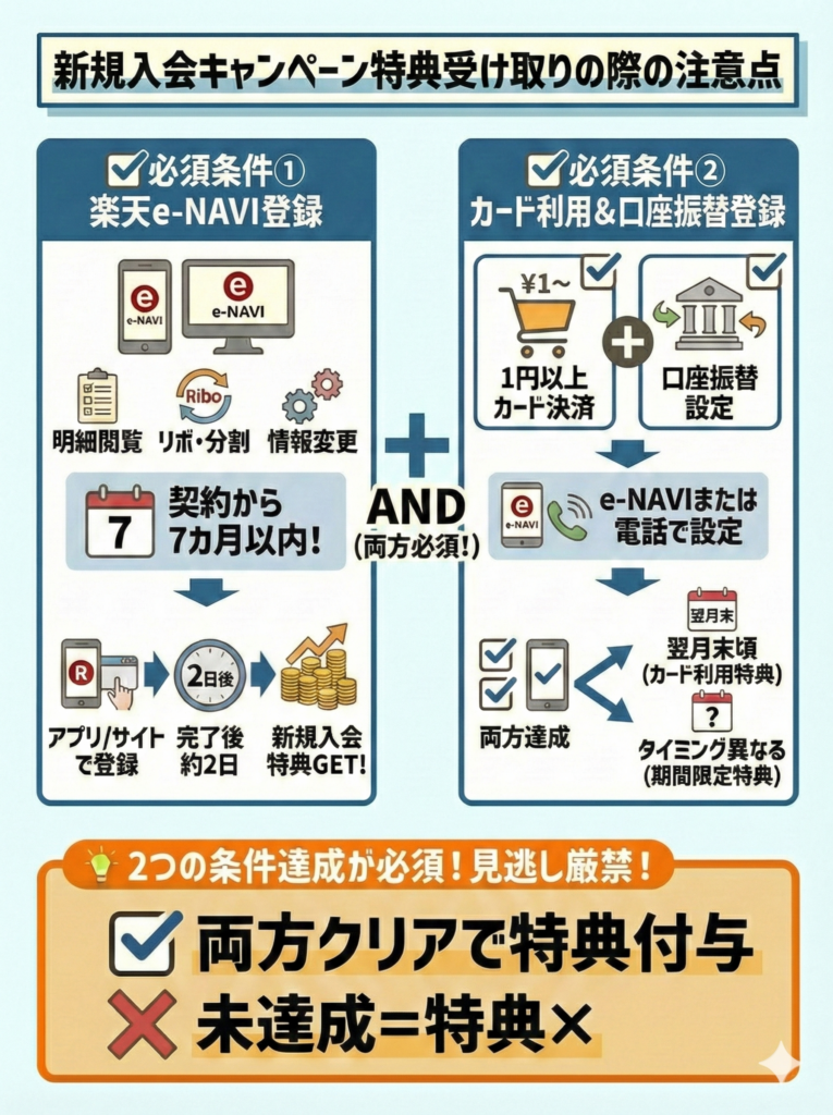 新規入会キャンペーン特典を受け取るには、楽天e-NAVI登録とカード利用・口座振替設定の条件がある。