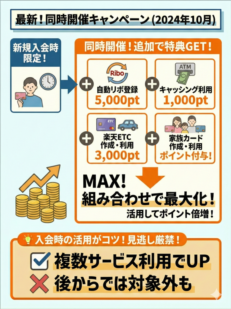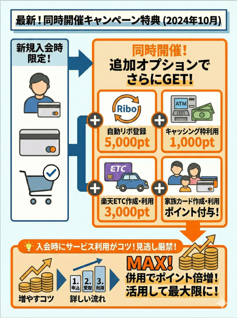 2025年11月21日10時〜2025年12月1日10時の公式FAQ案内では、楽天カード新規入会&利用で10,000ポイント進呈の例があった。
