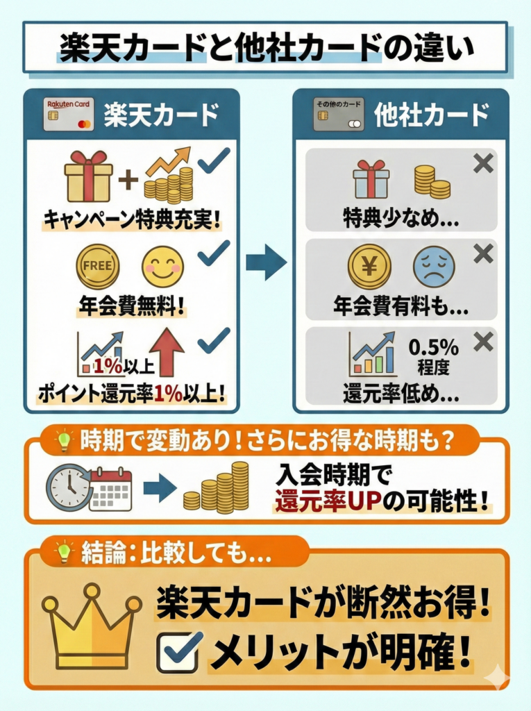 以下は、楽天カードと他社カードの特徴をまとめたものである。