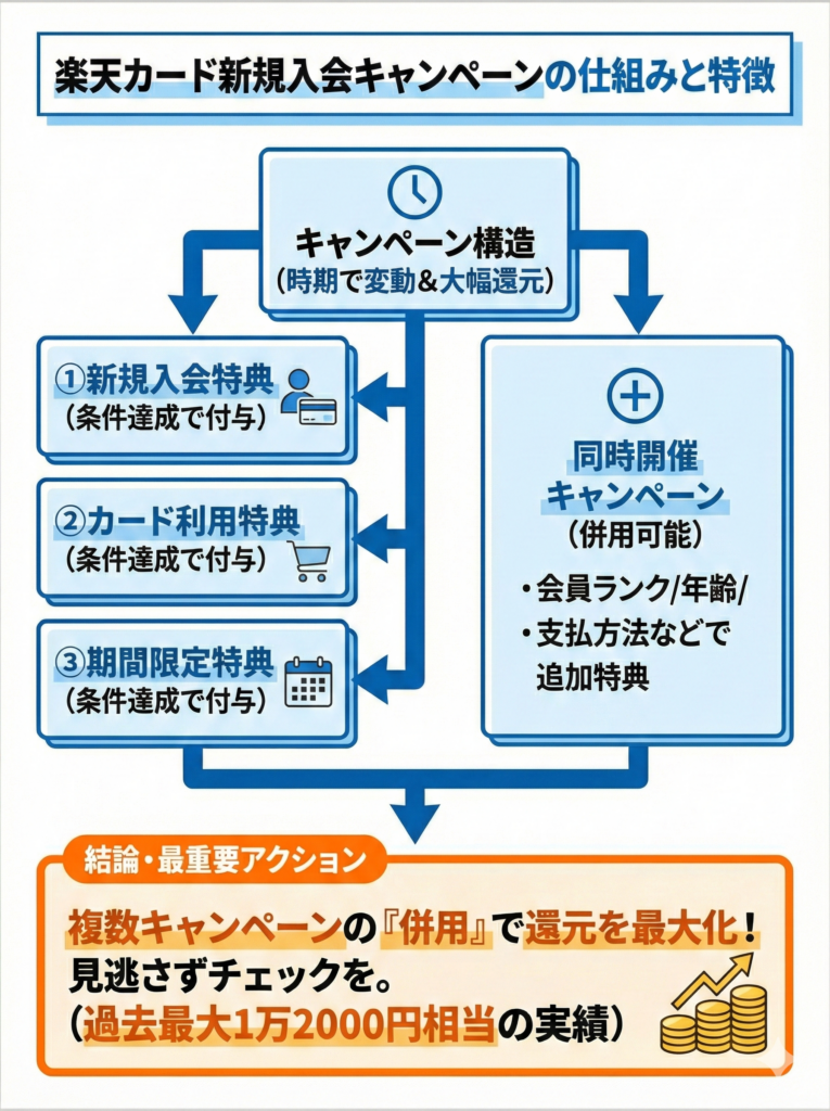 楽天カード公式FAQでは、新規入会キャンペーンに「新規入会特典」と「カード利用特典」が案内されており、ポイント数や条件は申込時のキャンペーンによって異なる。