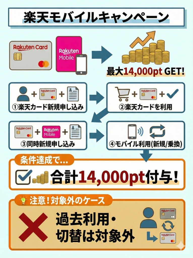 2025年11月21日10時〜2025年12月1日10時の公式FAQでは、楽天カード新規入会&利用で10,000ポイント、楽天モバイル初めてのお申し込み&開通で20,000ポイントの案内があった。