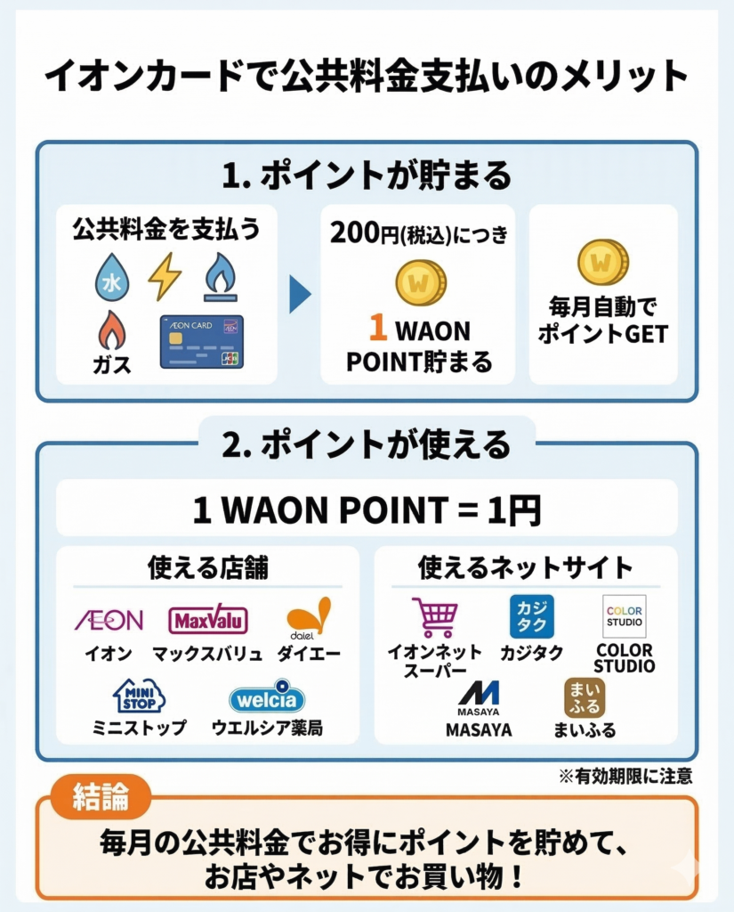 - イオンカードを使って公共料金を支払うとWAON POINTが貯まるためお得