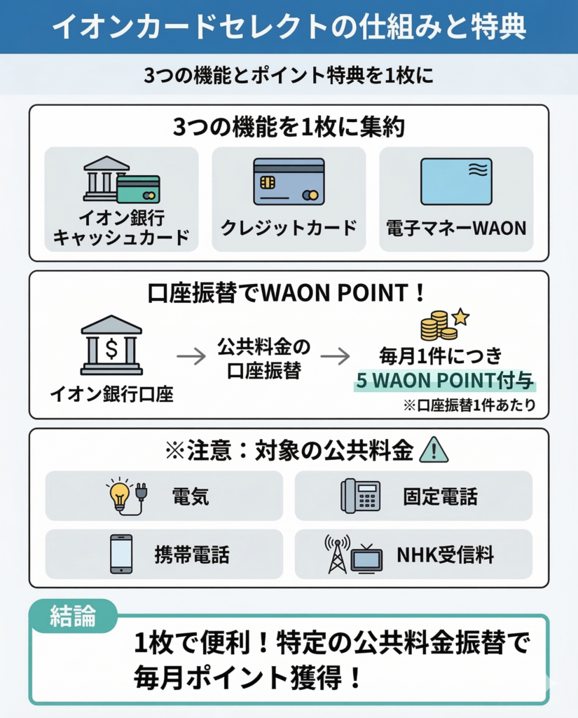 イオンカードセレクトで、イオン銀行の口座から公共料金の口座振替をしたときに、毎月振替1件につき5WAON POINTが付与される。