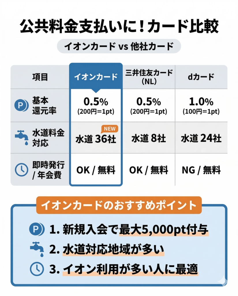 ここでは、公共料金の支払いができる他社のクレジットカード(三井住友カード(NL)・dカード)と、イオンカードの特徴の違いを解説する。