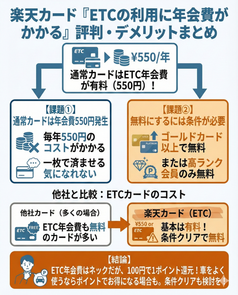 ETCカードは楽天ゴールドカード以上にしなければならず、年会費が有料になる点が少しネックに感じます。