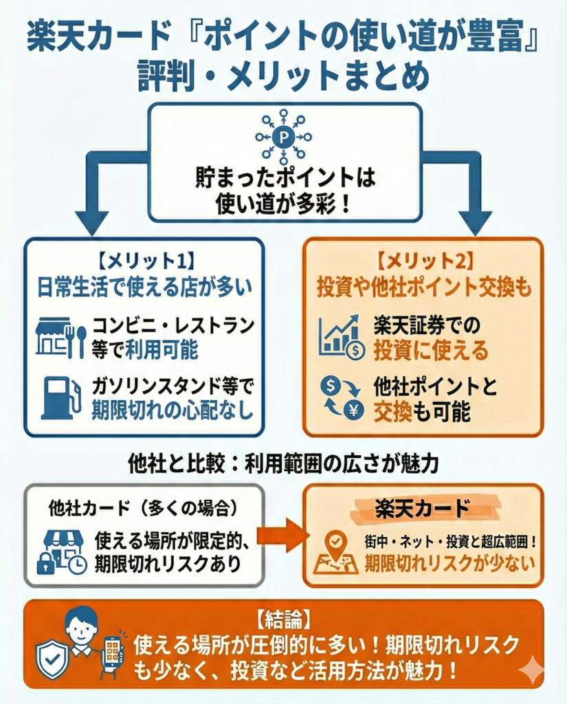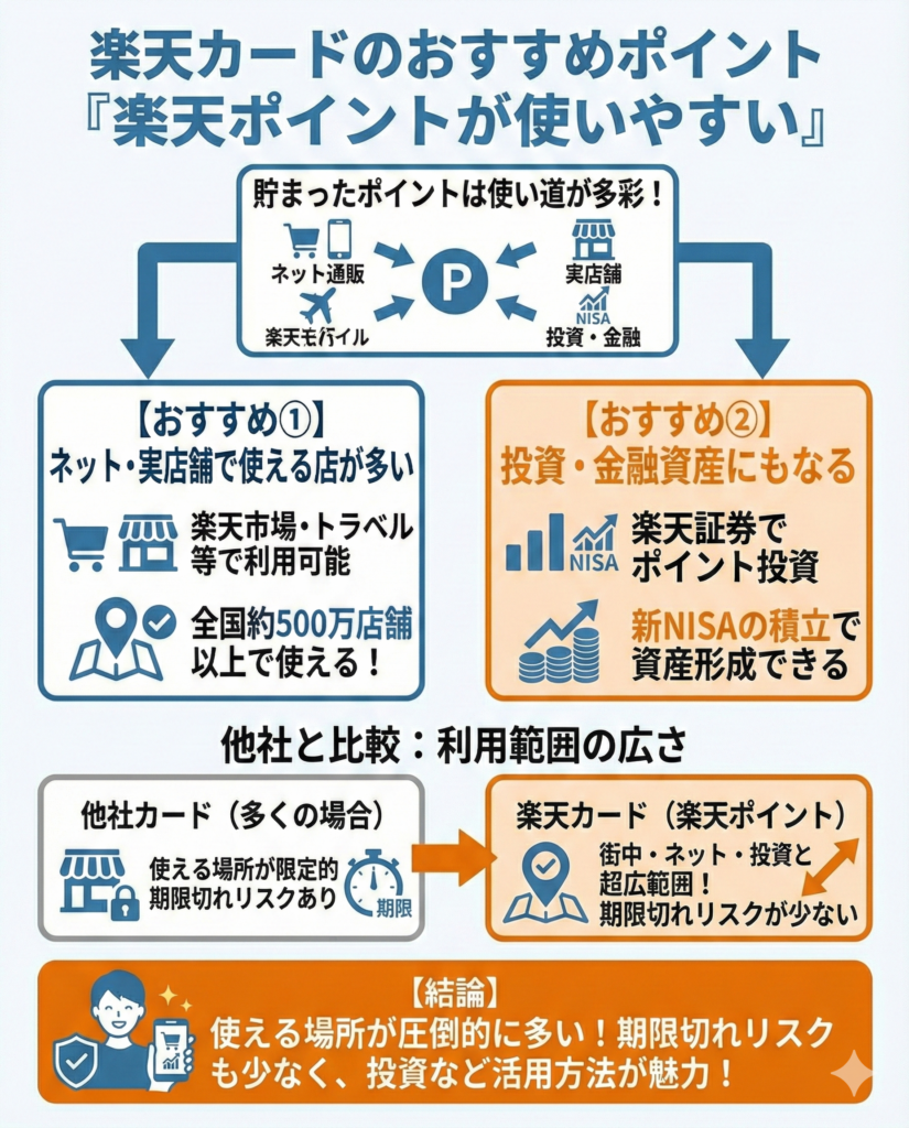楽天ポイントは、全国約500万店舗以上で使用できるほか、楽天市場、楽天証券、楽天ペイなど使い道が豊富である。