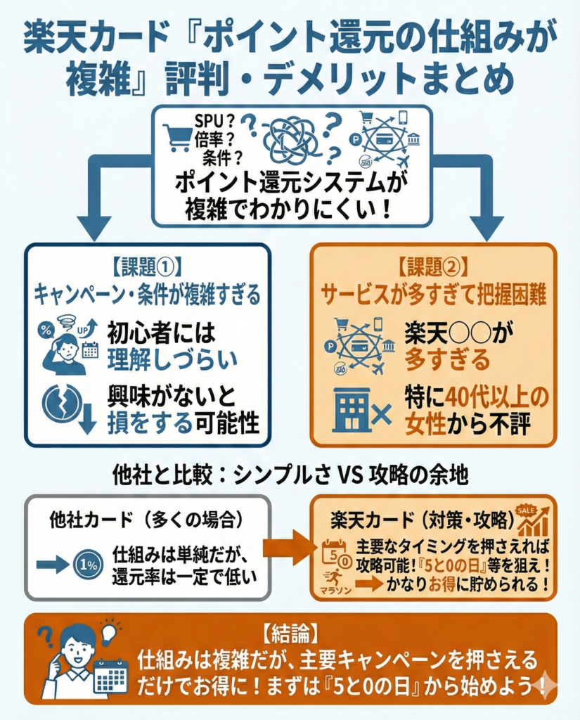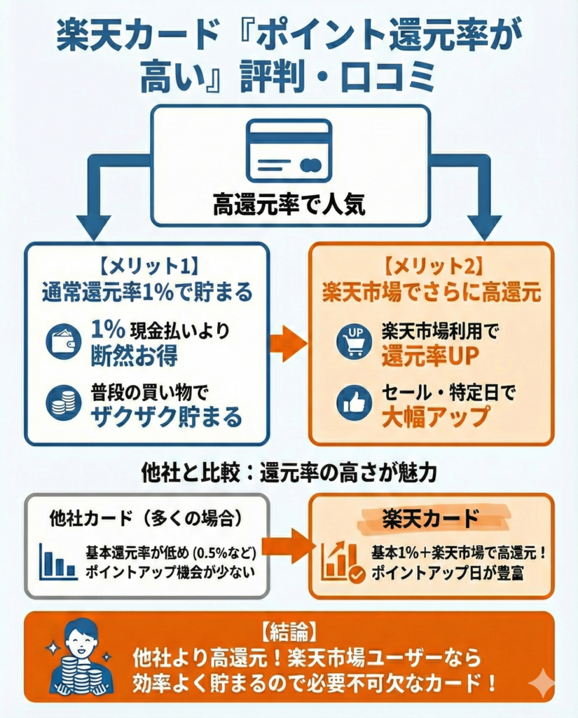 楽天カードのポイント還元率を評価する声がある一方で、仕組みが複雑という声も。