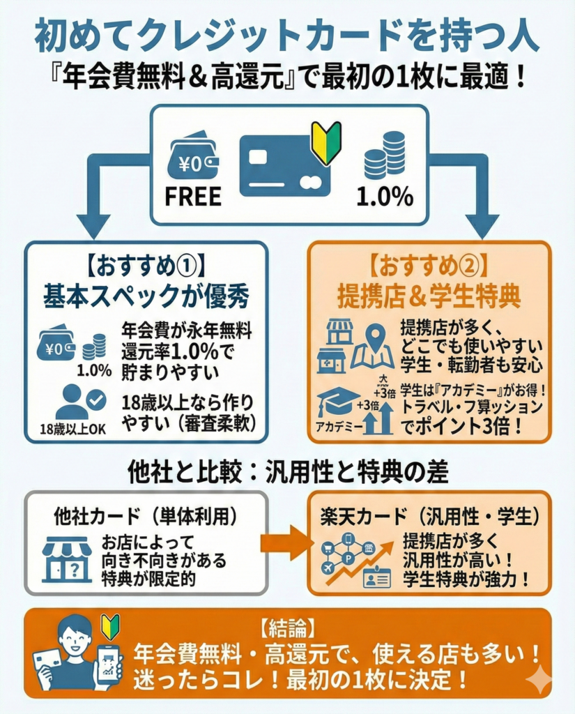 クレジットカードは、普段どのお店をよく使うかによって向き不向きがあるが、楽天カードは提携店が多いため、これから社会人になる学生や転勤の多い人におすすめだ。