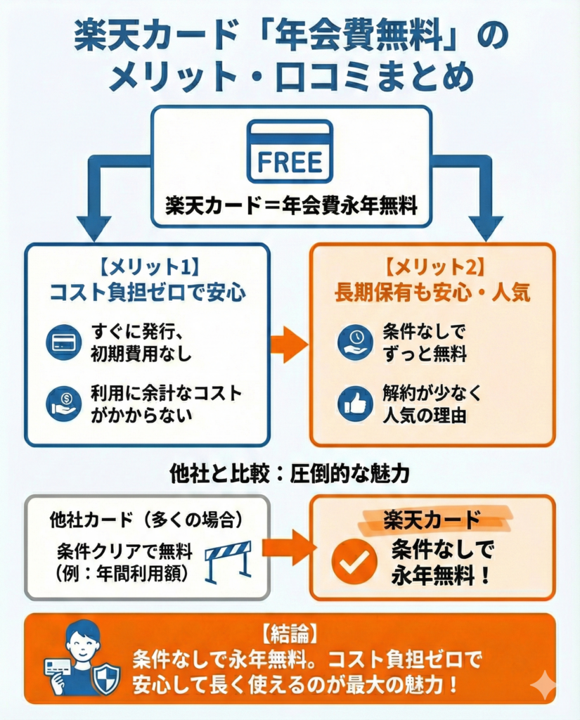 他社のカードは年会費無料になるための条件をクリアしなければならないのに対して、楽天カードは条件なしで永年無料なので安心して使える。