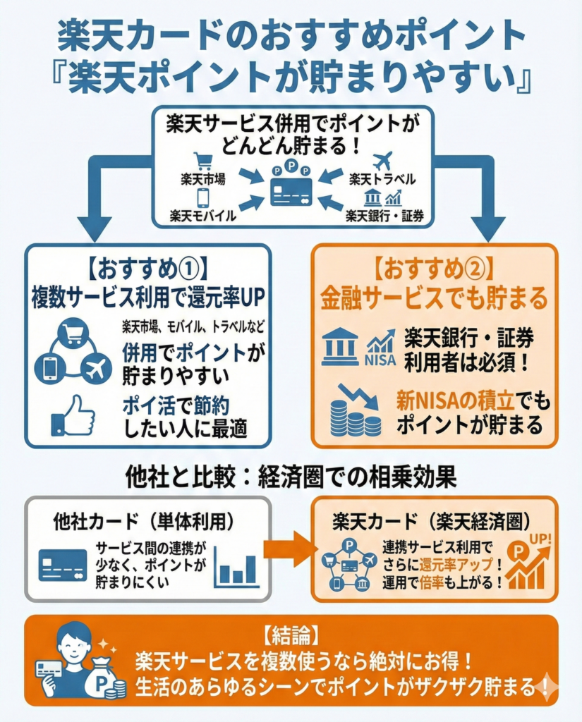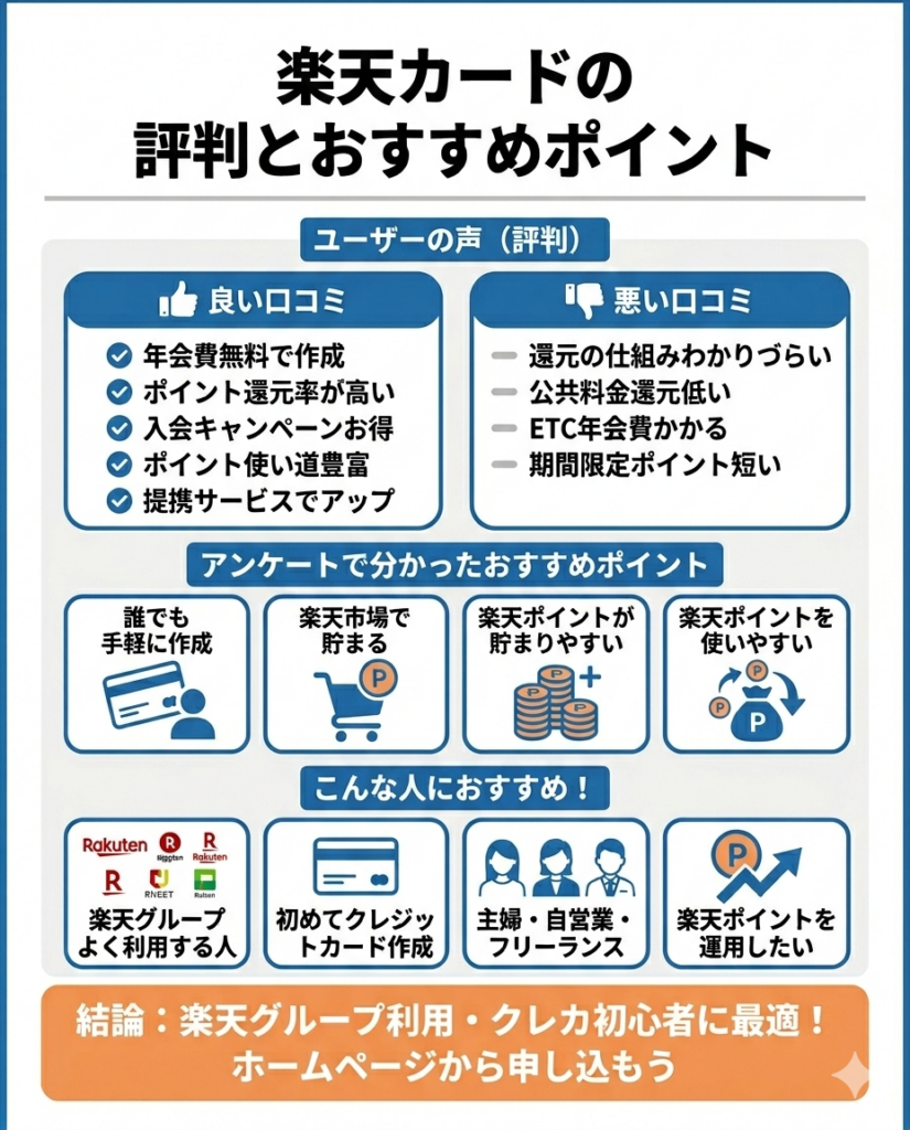 アンケートを踏まえた楽天カードのおすすめポイントは以下の4つである。