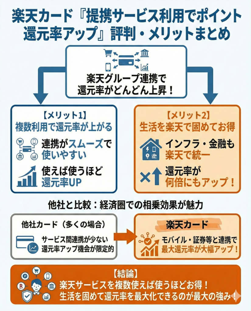 楽天内でさまざまなサービスを提供していて、複数利用するとどんどんポイントの還元率が上がっていくシステムが良いと思います。