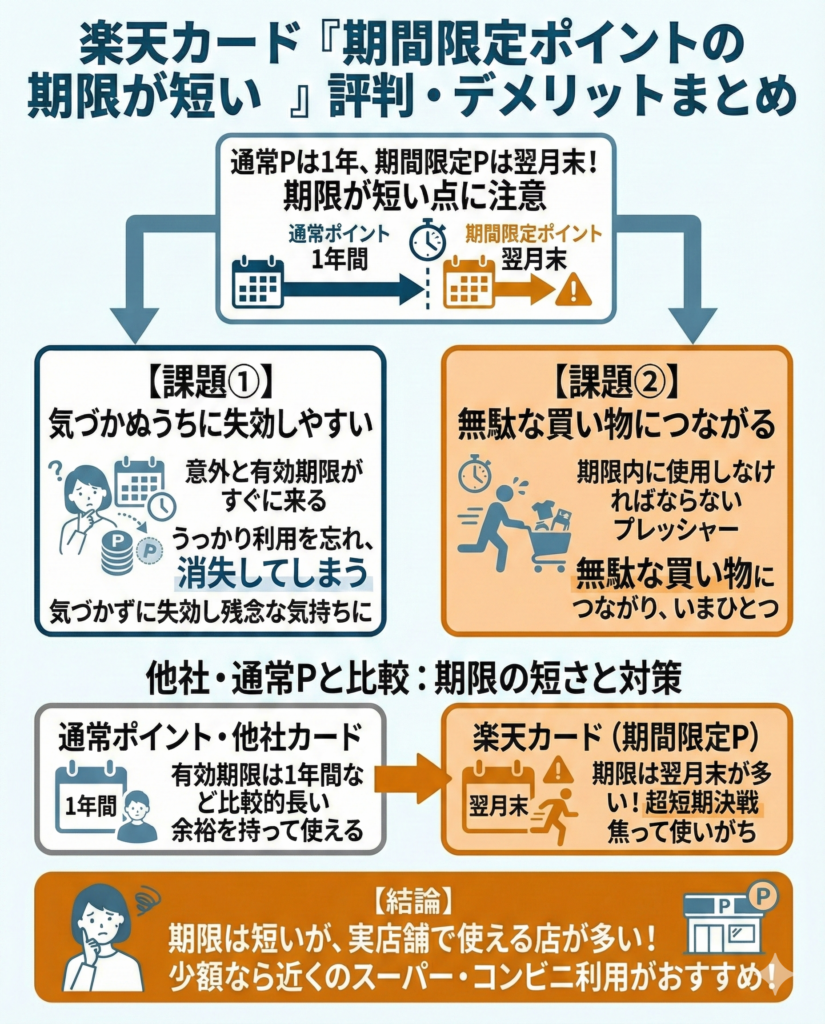 楽天ポイントの通常ポイントの有効期限は1年間であるのに対して、期間限定ポイントの期限は翌月末であることが多い。