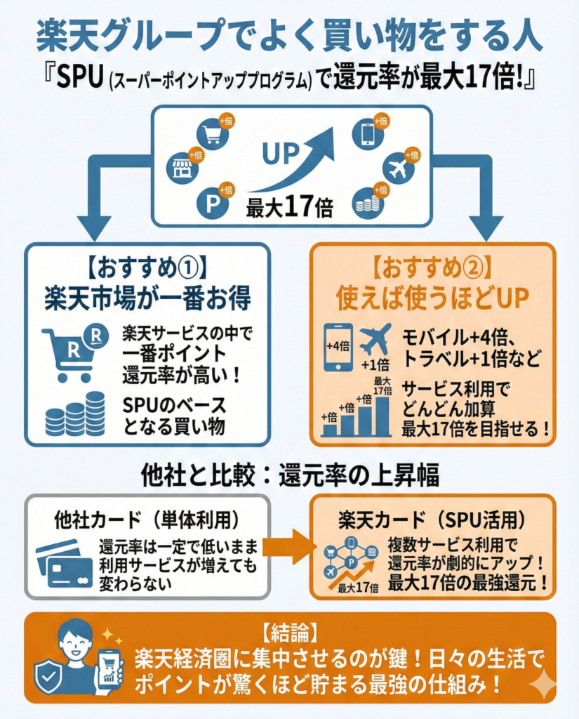 楽天カードには、SPU(スーパーポイントアッププログラム)というサービスもあり、楽天グループのサービスを利用する度に追加でポイントが付与される。