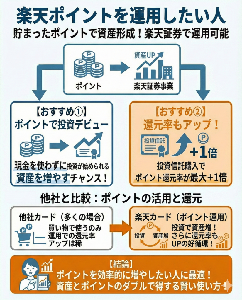 楽天カードでは、貯まったポイントを楽天証券で運用して資産を増やすことも可能だ。