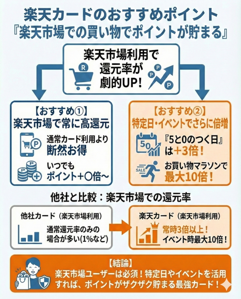 他社のカードと比較して、ポイントの還元率が高いところ。また、楽天スーパーセールや5、0が付く日などポイントアップの日がたくさん設けられていることも楽天カードの良い点だと思います。