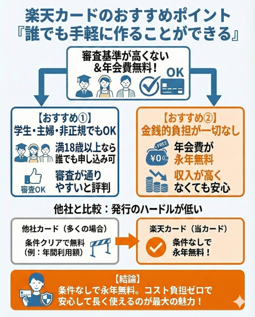 楽天カードは年会費無料であり、18歳以上の人ならほとんどの人が作成できる。