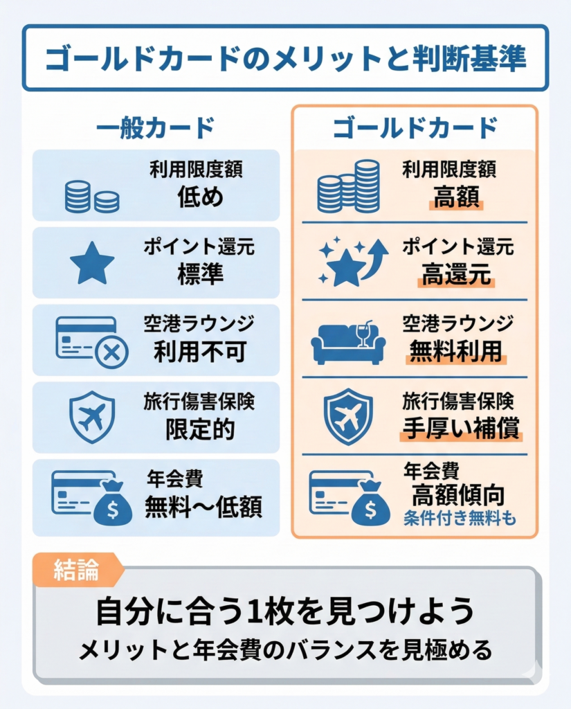 ゴールドカードは、一般カードに比べて利用可能枠やポイントアップ特典、付帯サービスが充実する商品があります。