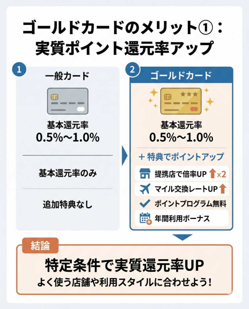 ゴールドカードにランクアップすることで、実質還元率がアップすることもあります。