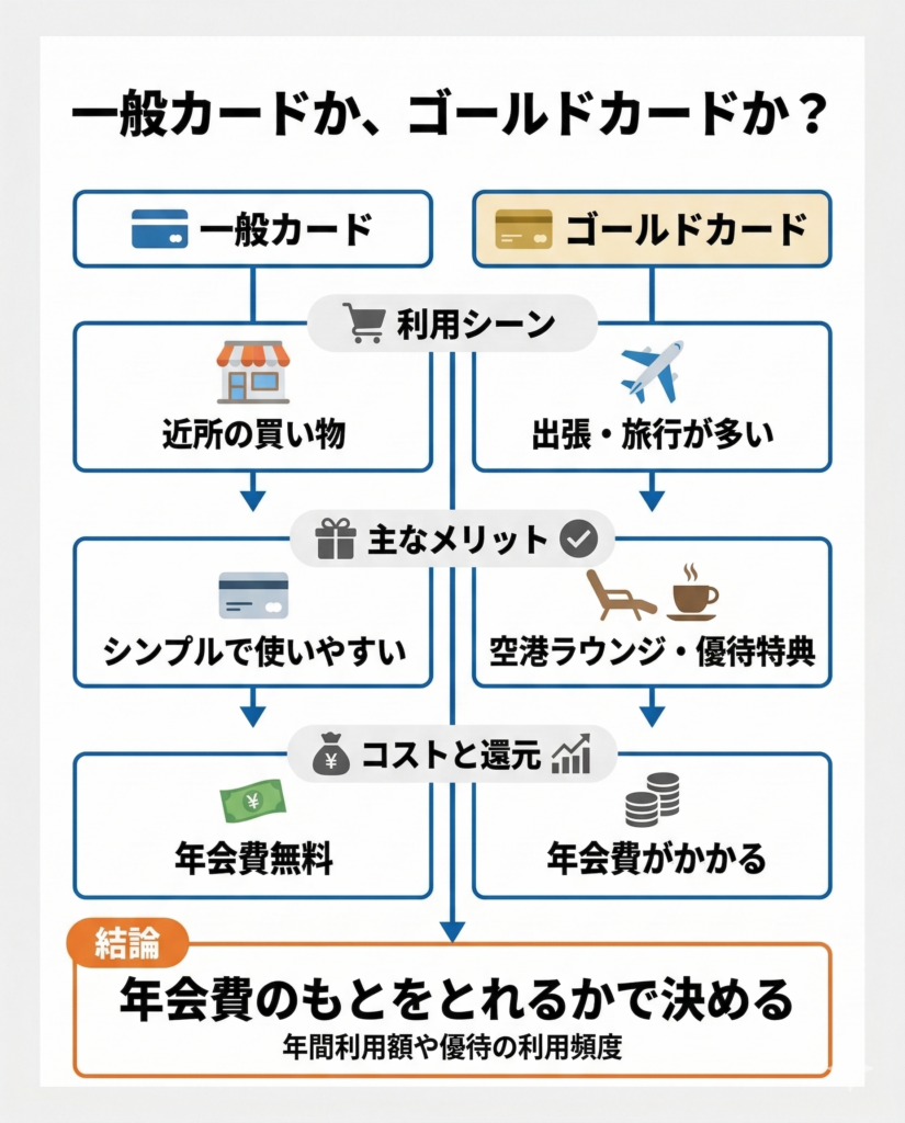年会費のもとをとれるか、年会費以上のメリットを感じられるかによって、ゴールドカードにするか一般カードにするか決めましょう。