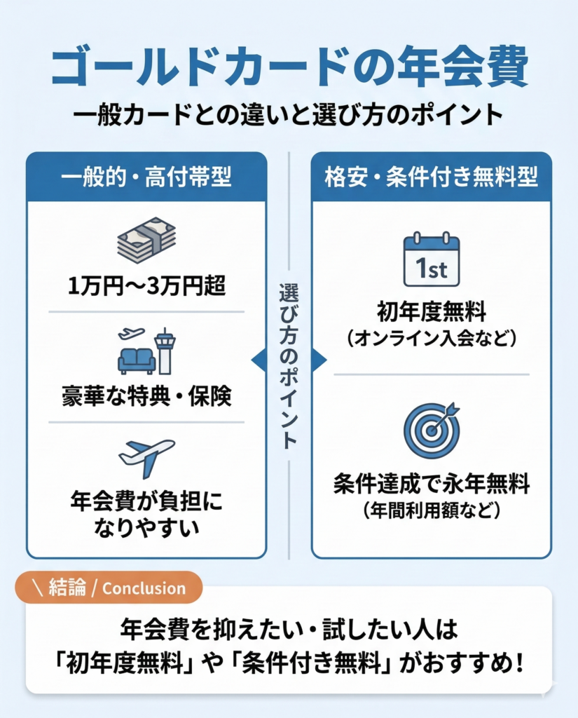 中には楽天ゴールドカードやイオンゴールドカードのように、年会費が安かったり、永年無料で利用できたりするカードもあります。