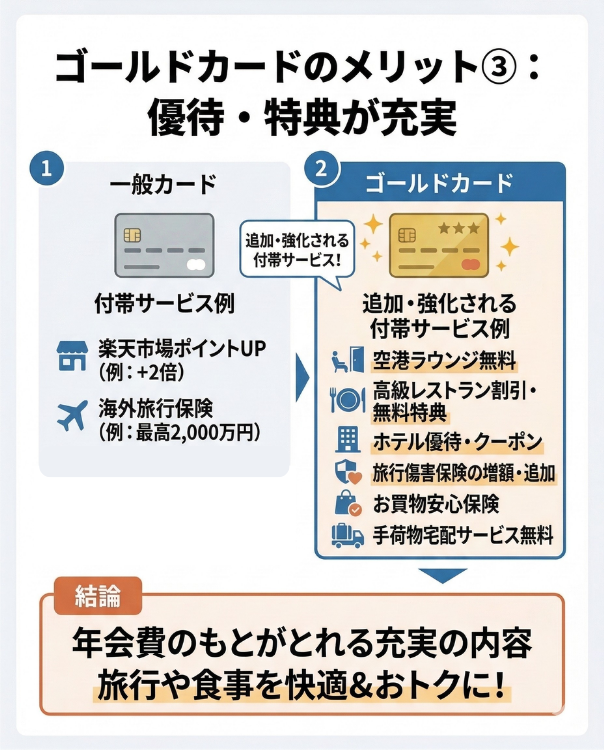 また、一般カードにすでになんらかの優待サービスがついている場合、ランクアップによって優待内容が追加・強化されます。