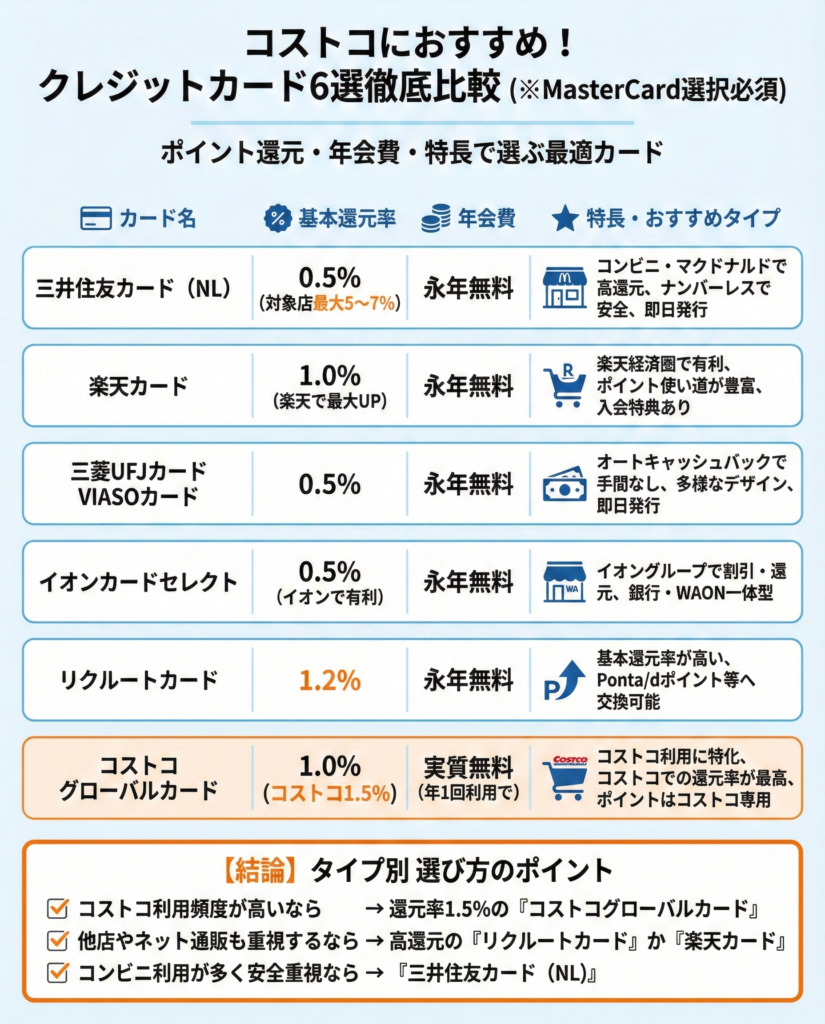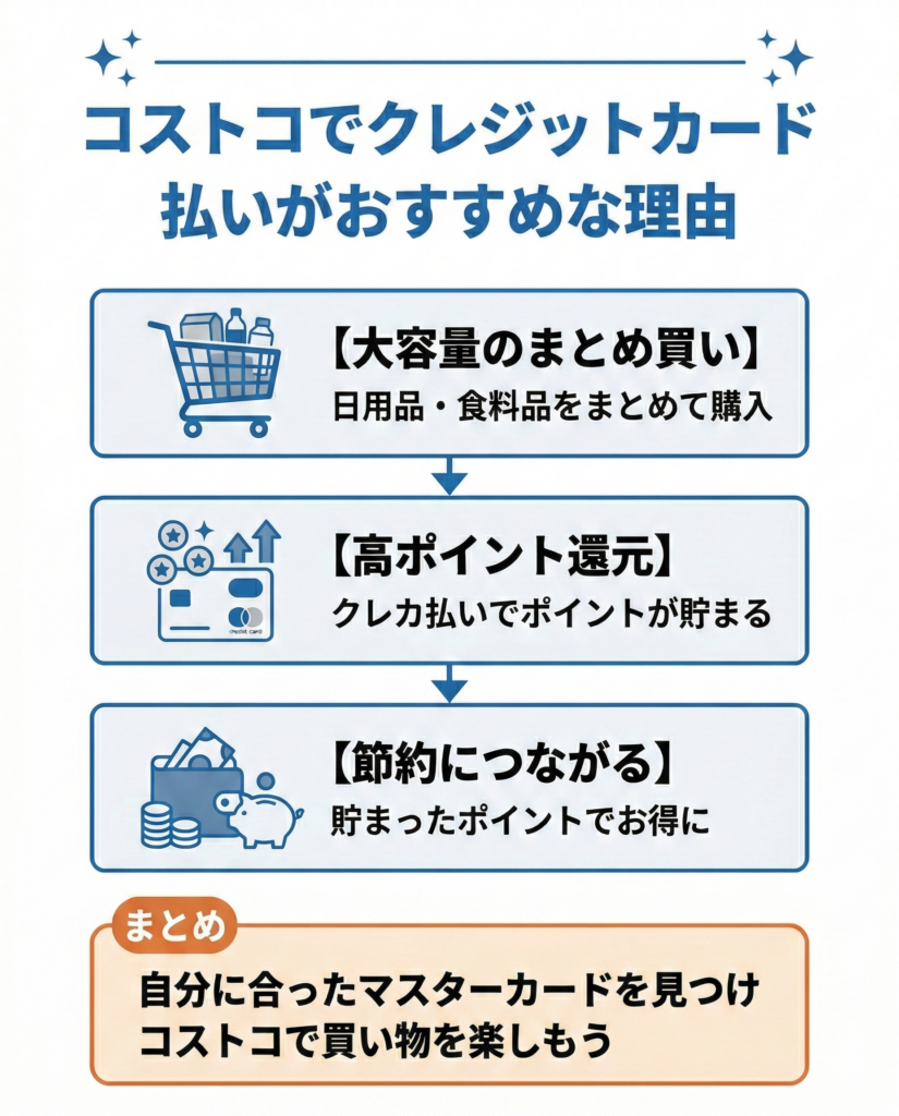 コストコで使えるおすすめのマスターカードのクレジットカード厳選6選を紹介しました。