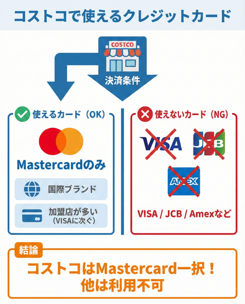 コストコ倉庫店でクレジットカード決済をする場合は、Mastercard®ブランドを選ぶ必要があります。