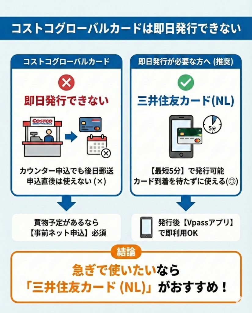 コストコグローバルカードは、オンライン申込でデジタルカードを即日発行できますが、物理カードは後日郵送されます。