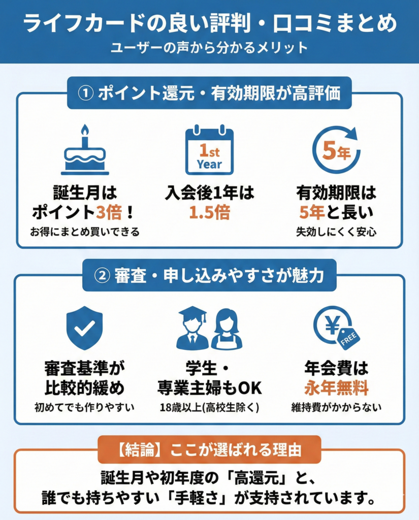 実際に使っている人の口コミをもとにしたライフカードの良い評判・悪い評判をそれぞれ紹介します。