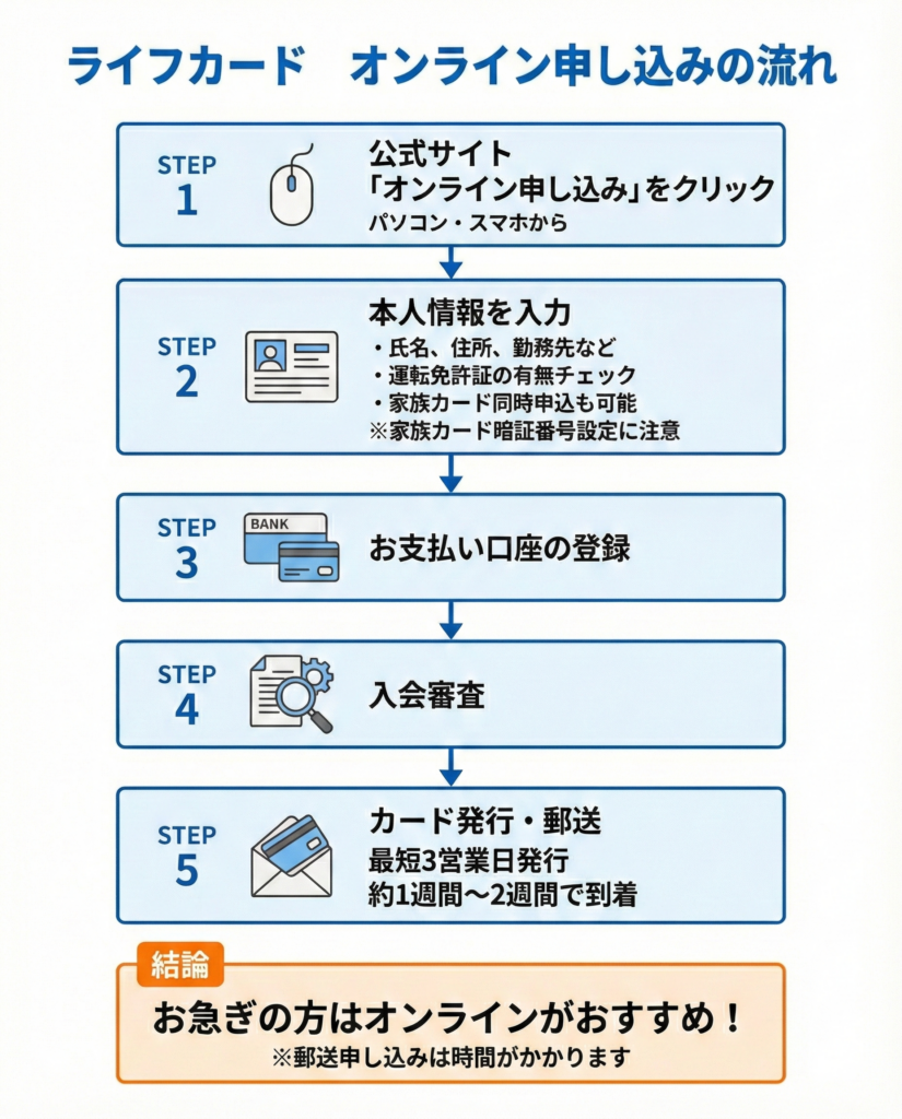 ライフカードの申し込み手順は次の通りです。パソコン・スマホからオンラインで申し込みできます。