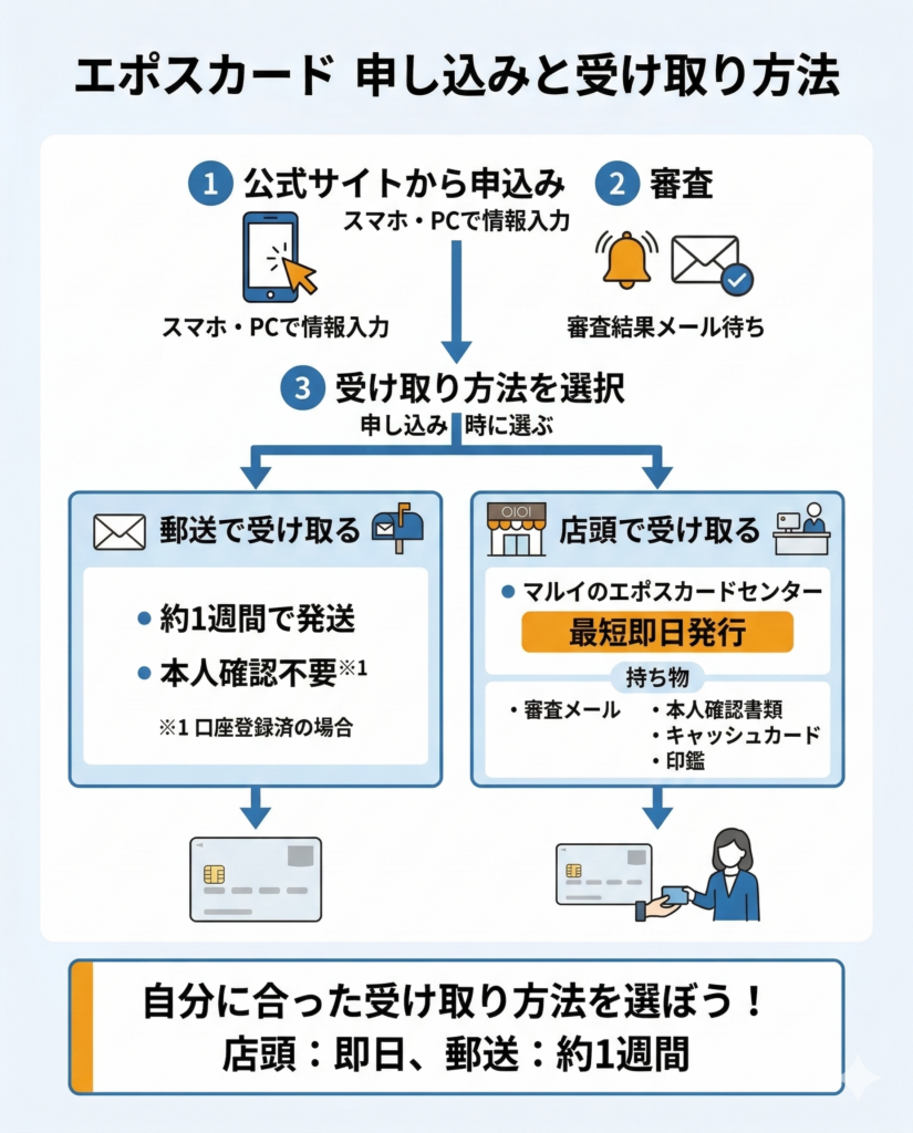 - 株式会社エポスカード『ネットで申し込んだ場合、カードはどのように受け取れますか?』(公表日/更新日:2025-03-11)