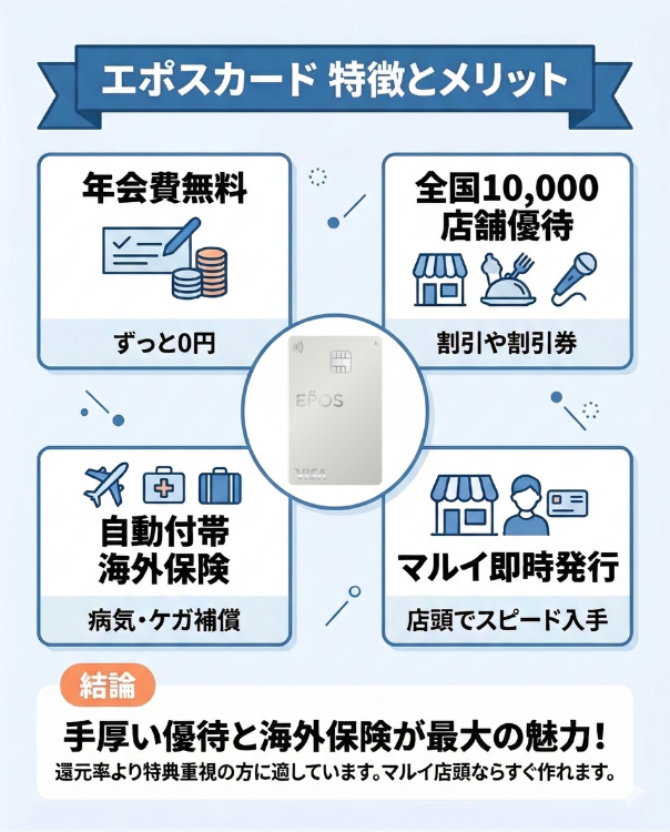 エポスカードは年会費無料でありながら全国約10,000のレストランやアミューズメント施設の優待と、海外旅行傷害保険が付帯するクレジットカードです。施設ごとに優待内容が異なるため、日常的に使う店舗が対象なら節約につながります。