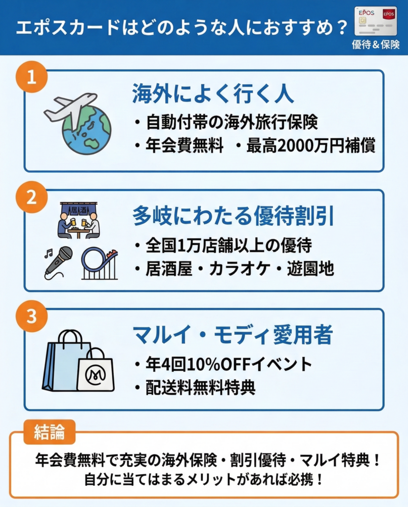 エポスカードでは海外旅行傷害保険など、海外旅行向けのサービスが付帯しています。しかし、国内利用が中心の人や、そもそも旅行に行かない人にはこれらの特典を利用する機会が少ないでしょう。