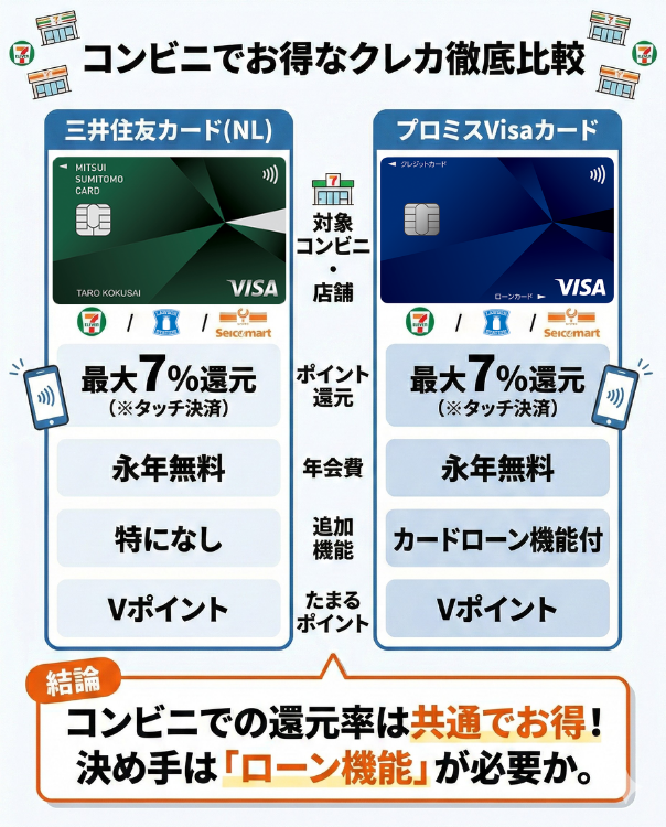 セブンイレブン、ローソンでの利用で還元率が高い、おすすめの1枚は三井住友カード(NL)とプロミスVisaカードです。