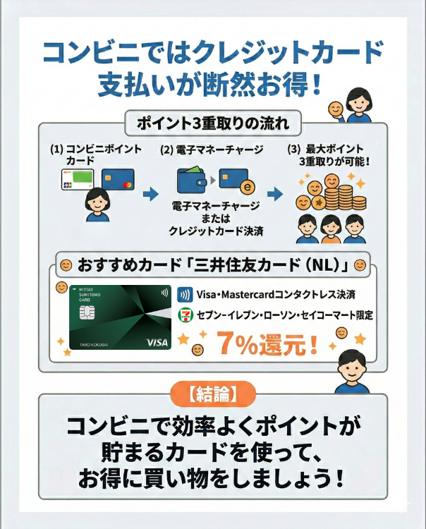 コンビニでの支払いは、クレジットカード払いがお得です。現金払いよりもポイントが貯まり、電子マネーとの組み合わせやポイントカードとの組み合わせによってはポイントの3重取りが可能になる場合もあります。