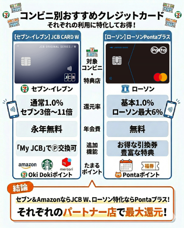 セブンイレブン、ファミリーマート、ローソンなど、それぞれの利用に特化してお得にポイントが貯まるカードを紹介します。