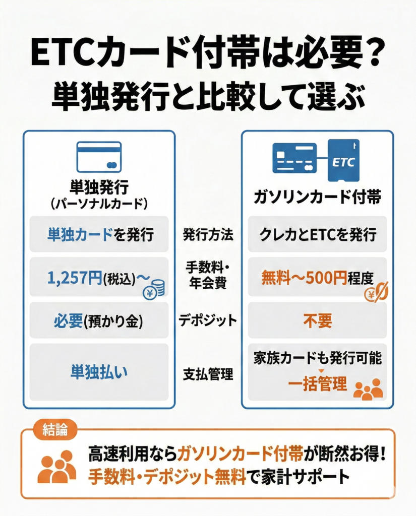 ETCカードはクレジットカードに関係なく単独で発行することもできます(ETCパーソナルカード)が、発行手数料・年会費として1,257円(税込)がかかり、別途預かり金(デポジット)も必要です。