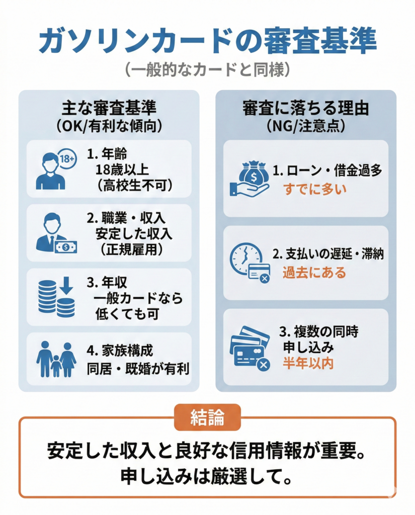 ガソリンカードはクレジットカードなので、発行には審査が必要です。また、審査基準は一般的なクレジットカードと同様であり、ガソリンカードだからといって特別な審査が行なわれるわけではないので安心してください。