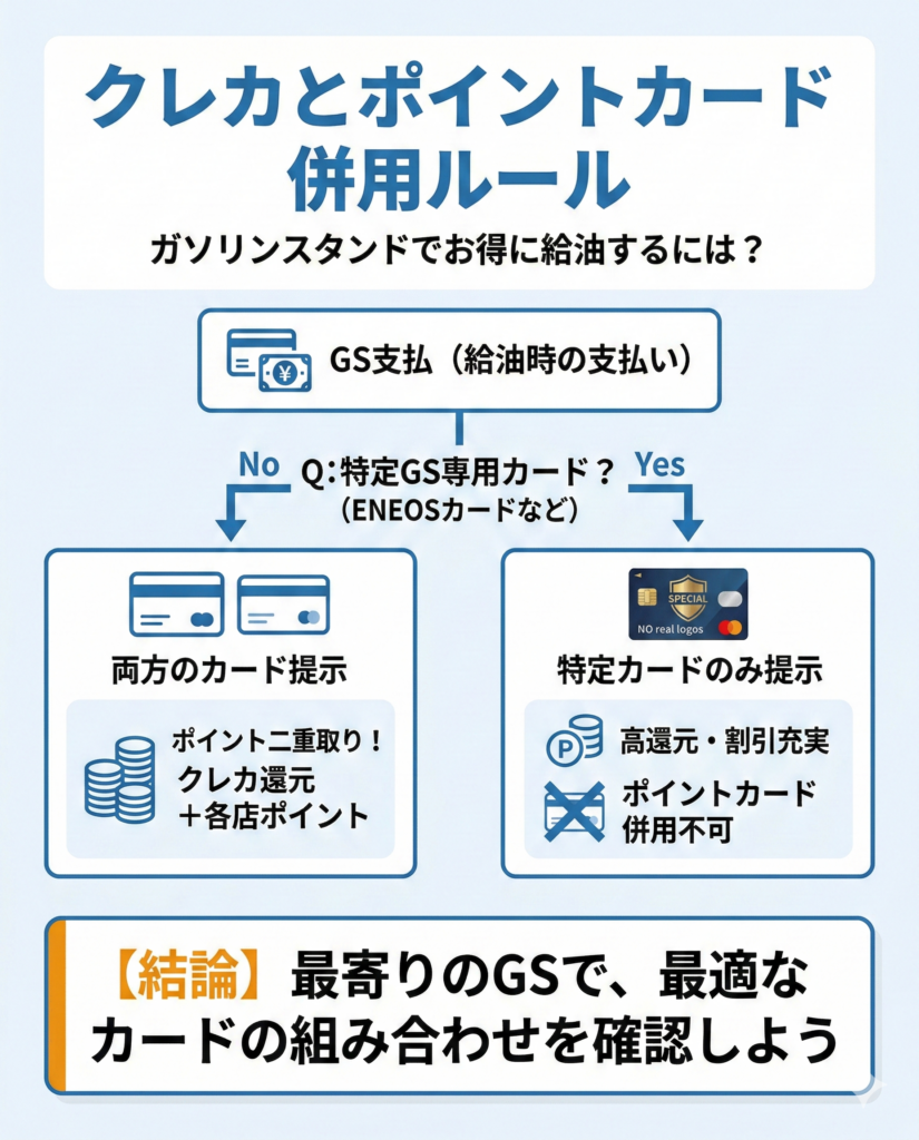 ただし、クレジットカードによっては併用不可の組み合わせもあるため注意が必要です。たとえばENEOSでENEOSカードを使用すると、ポイントカードは併用不可になります。