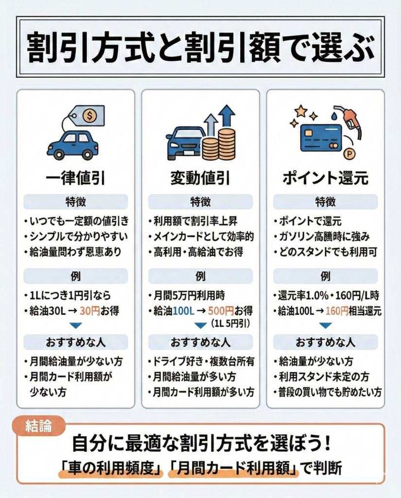 ただし、給油量が多いと変動値引タイプの方が割引額が大きくなりやすいです。