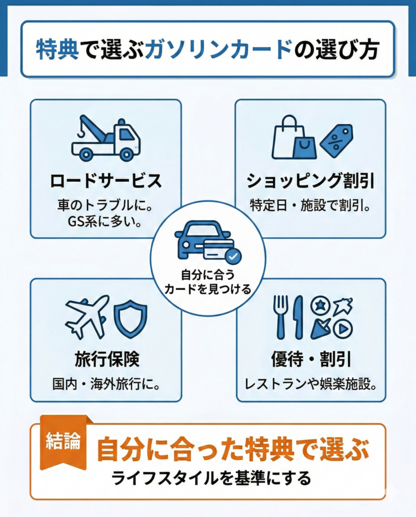 ガソリンカードの中には車の運転や日常生活に役立つ特典(付帯サービス)を備えているものも多いので、好みの特典があるかどうかで選ぶのもよいでしょう。