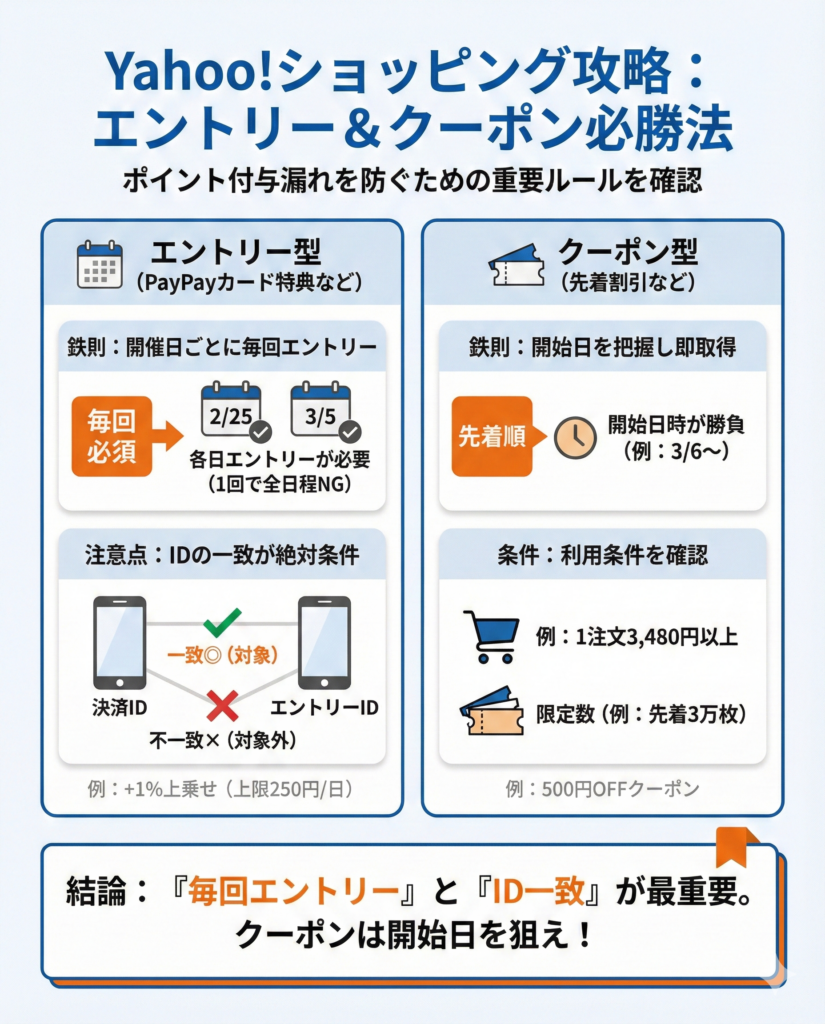 本記事の一覧表および個別解説で企画ごとのエントリー要否を整理しています。Yahoo!ショッピングの+1%企画のように日別開催型は開催日ごとのエントリーが必要です。また、エントリーに使うYahoo! JAPAN IDと決済に使うIDが一致していないと対象外になる点にも注意してください。